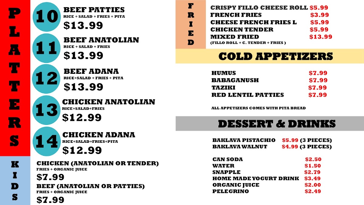 “ Amazing food. The savior from food court boring flavors. There is so much on the menu you must go multiple times to try it all. The staff let me try things to see if they pleased my palate and, boy! it all did. The pride and passion the staff have for sharing their culture permeates their level of service and interactions. I settled on beef adana, and red lentil hummus. Adana came with a savory rice, red cabbage, lettuce, carrot vinaigrette salad, and a small portion of french fries. The contrasts in textures were great. Lentil humus came with pita chips fried perfectly to disintegrate into your mouth. I also liked dipping my fries in the hummus. Once he put the garlic sauce on the beef, then it was heaven on a tray. Filling, delicious. Places like this are what make America Great! Fusion of flavors and sharing the best of cultures makes me filled with happiness. Must Must Must come back again and again. ”